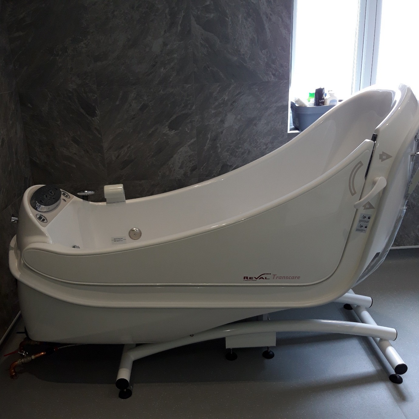 The Reval is a highly versatile bathing system, which is ideal for patients with reduced posture control. The vertical-raise side door allows easy patient access and the high-low function prevents risk of caregiver back strain. The Transcare system also has a unique tilting function, which allows patients with challenging conditions to semi-recline while fully immersed comfortably in water.
